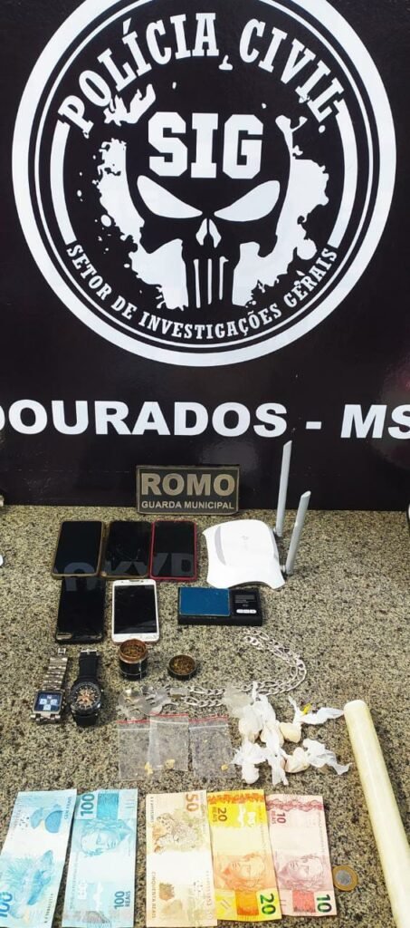 Policiais do SIG – Serviço de Investigações Gerais foram acionados pela GM e compareceram ao local. Juntos as equipes localizaram escondidas no imóvel mais 10 pedras de crack já embaladas, 01 balança de precisão, vários aparelhos de celulares, relógios, corrente, óculos e R$ 281,00. O celular da marca Samsung que a adolescente possuía oi constatado que era produto de furto, ocorrido em 2019 durante as checagens no sistema policial.