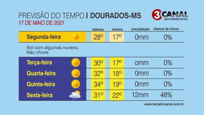 Dessa forma o dia será de grande amplitude térmica e baixa umidade do ar nas horas mais quentes do dia. A variação está estimada entre 70% a 20%.