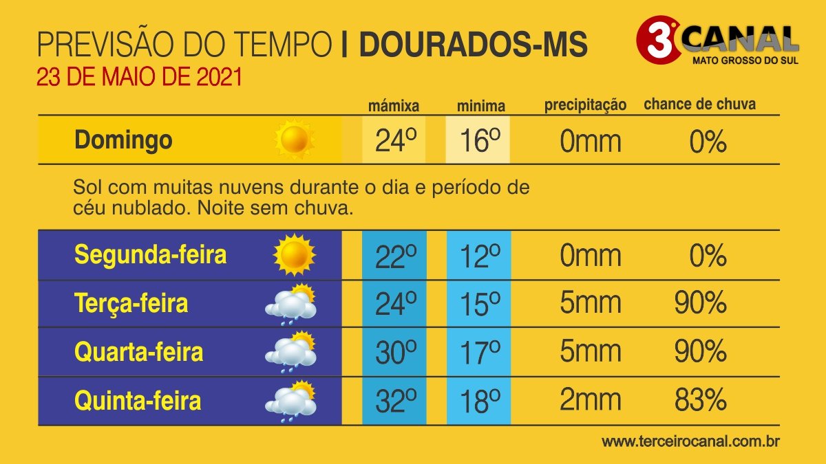 As condições serão de céu parcialmente nublado a nublado. A meteorologia indica chuva para todo Mato Grosso do Sul com moderada a forte intensidade. As rajadas de vento podem chegar a 50km/h.
