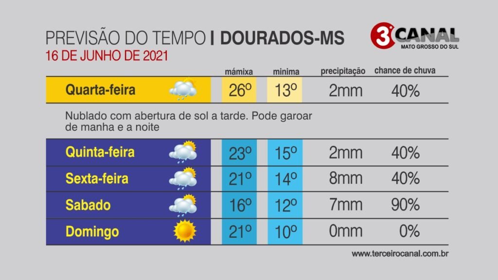 As condições estimadas pela meteorologia são de sol com tempo claro com poucas nuvens em todas as áreas do Estado. Mas com possibilidade de garoa durante a tarde e a noite para Dourados.