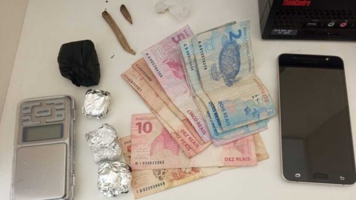Na abordagem, foram encontrados 02 cigarros de maconha ao lado dos indivíduos totalizando 1,2g. Ainda no bolso de um deles, os agentes encontraram uma pulseira de prata, que o acusado não soube informar a procedência, mas que iria vender. Foi localizada também no bolso a quantia de 20g de maconha, além de R$ 108,00 reais, em varias cédulas tais quais: (01 cédula de R$50,00, 04 de R$10,00, 02 de R$5,00 e 04 cédulas de R$2,00), não sabendo também informar a procedência do dinheiro. Com apoio da equipe do SIG da Polícia Civil, foi encontrado na residência de um dos jovens, 20g de maconha divididas em três porções e uma porção de pasta base/crack pesando 0,2g.