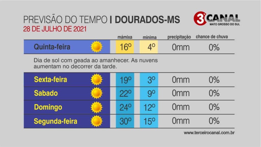 Em Dourados, por exemplo, o dia começa com 18°C, mas antes mesmo das 14h pode cair para 14°C. Já Dourados vai de 22°C para 18°C no mesmo período.