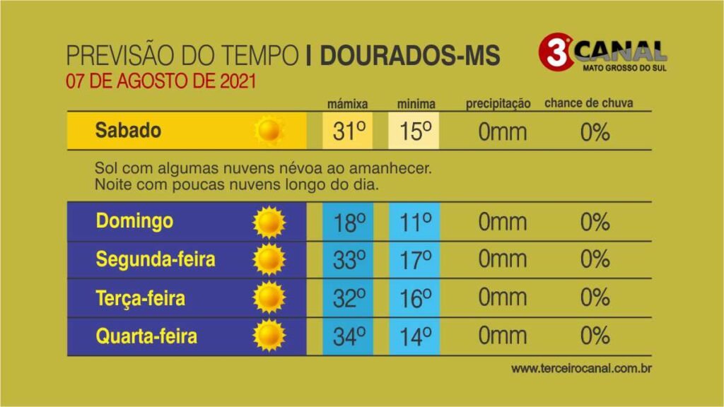 A amplitude térmica ainda se fará presente em Dourados com a madrugada podendo registrar mínima de 15°C em e a máxima pode chegar aos 31°C.