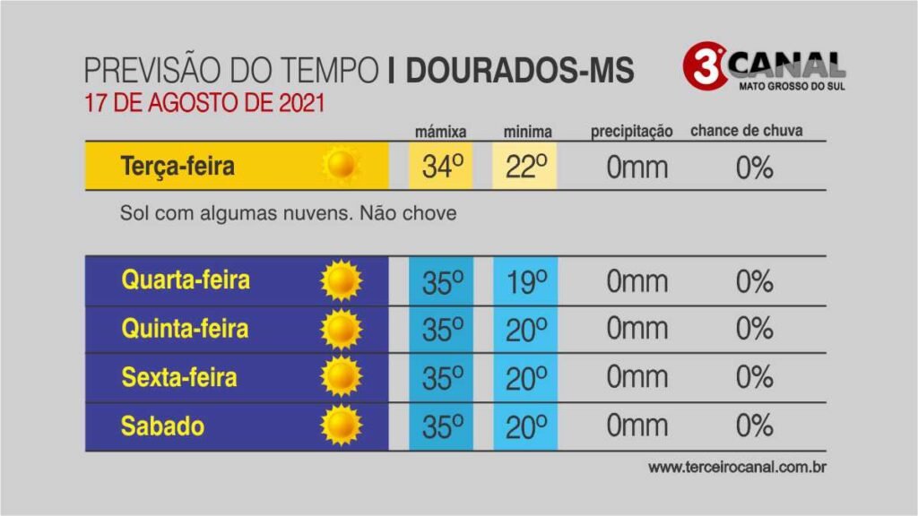 A tendência é de grande amplitude térmica, pois o Estado pode ter mínimas em torno de 15°C e as máximas podem chegar aos 40°C na região sudoeste e pantaneira.