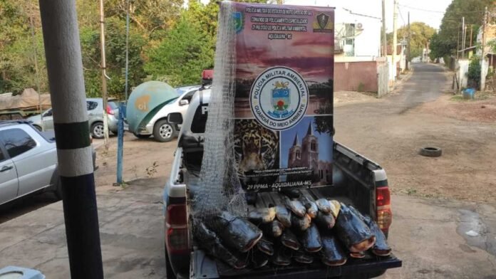 Depois de prender no dia (20) à tarde, um pescador profissional (42), residente em Bonito, e apreender 240 kg de pescado capturado ilegalmente no rio Aquidauana, além de um veículo, ontem (21), Policiais Militares Ambientais de Aquidauana prenderam outro pescador profissional por pesca predatória. A prisão ocorreu durante operação fluvial no rio Aquidauana, próximo ao porto da fazenda Itacaru, quando uma equipe abordou uma lancha de pesca profissional, de propriedade do pescador, de 59 anos, residente em Anastácio.