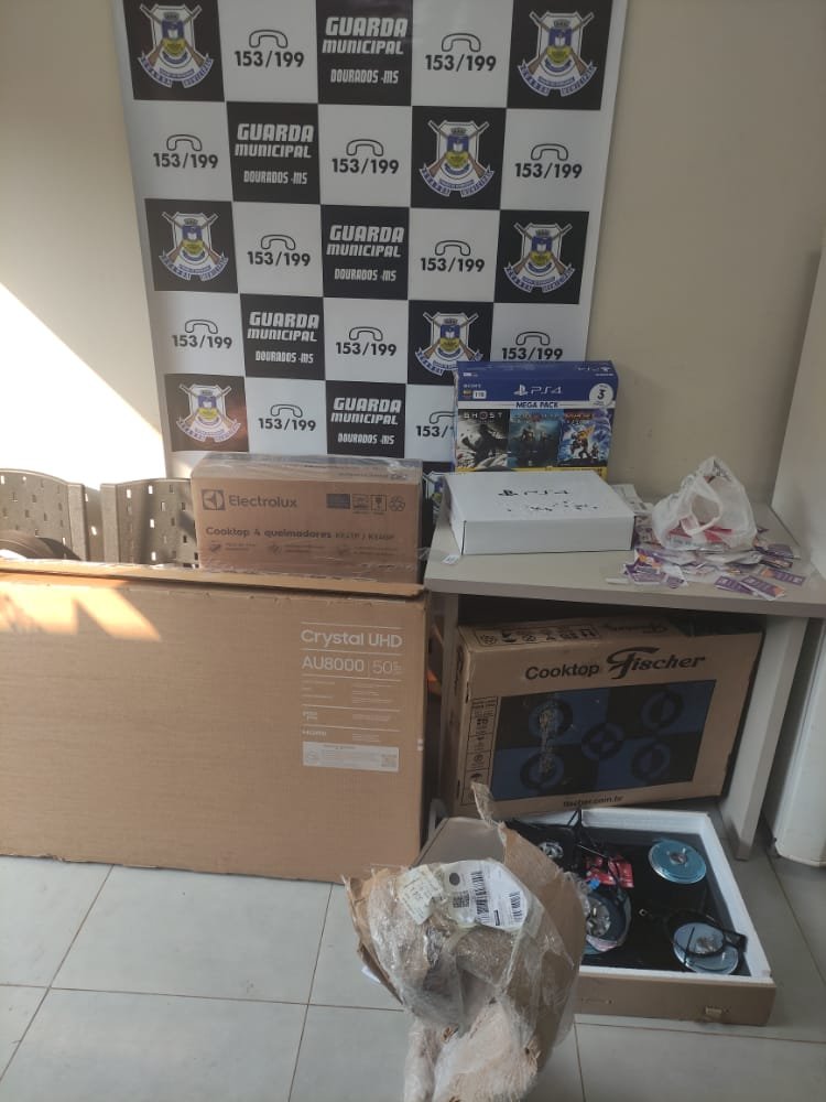 Que no dia anterior, já teriam sido retirados uma TV 50 polegadas, um Playstation 4 e um Notebook, e ao ser questionado dos produtos o acusado relatou que estavam em sua residência. Uma equipe do SIG e da Guarda Municipal foram até o local e aprenderam esses produtos, não localizando o notebook. Outros aparelhos novos onde o acusado não soube explicar a procedência foram apreendidos: