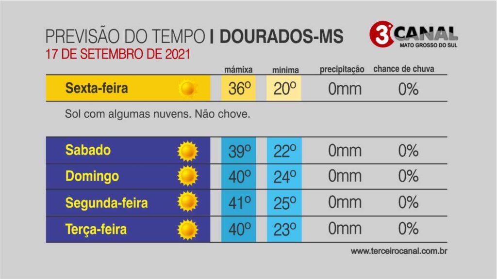 Mesmo não parecendo, a estação oficial ainda é o inverno, que começa a se despedir dando lugar a primavera que começa oficialmente na próxima quarta-feira (22). Os destaques do último final de semana do inverno, serão o calor que pode até passar dos 40°C em algumas áreas e o tempo seco que reacende o alerta de cuidados com a saúde e especialmente com as queimadas em Mato Grosso do Sul.
