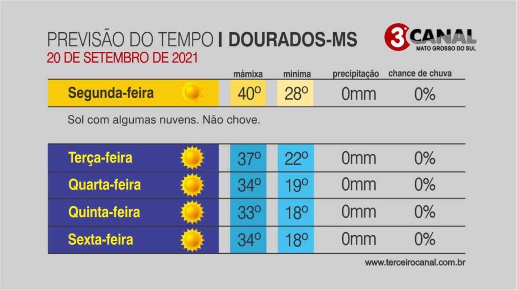 “As oscilações na atividade do evento de La Niña no momento em condições de Neutralidade devem elevar mais uma vez, as médias das temperaturas máximas nas regiões Norte, Oeste, Leste e Central. Campo Grande, Corumbá, Água Clara, Três Lagoas e Sonora podem ter extremos máximos em Outubro e Novembro e podem apresentar novamente alerta de estiagens”.