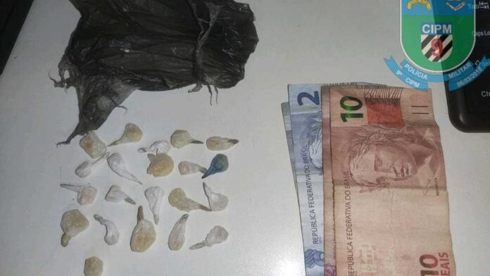 Neste momento os policiais militares realizaram a abordagem no jovem (18) e foi encontrado em um dos bolso de sua blusa vários papelotes de uma substância análoga a pasta base.