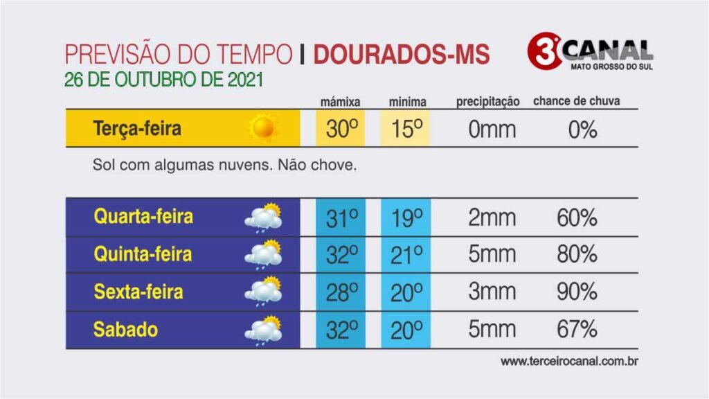 A meteorologia prevê a volta da chuva sobre Mato Grosso do Sul para esta terça-feira (26), porém de forma localizada fazendo predominar o tempo firme sobre grande parte do Estado.