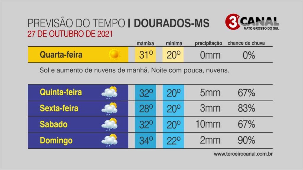 Confira abaixo as mínimas e as máximas estimadas pelo Climatempo para a Capital e algumas cidades sul-mato-grossenses nesta quarta-feira.