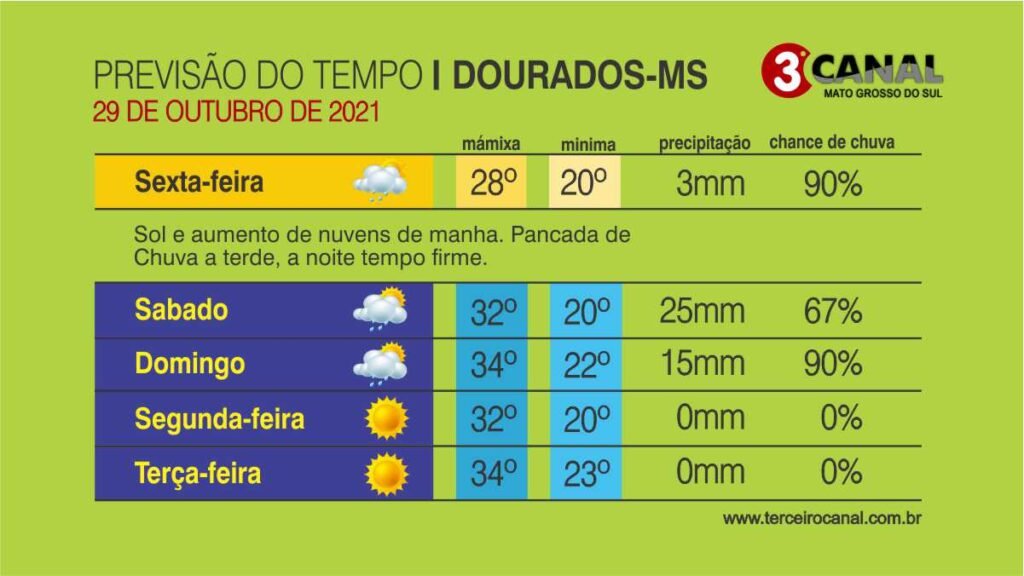 O Centro de Monitoramento do Tempo e do Clima (Cemtec) estima tempo instável entre esta sexta-feira (29) e a próxima segunda-feira (01). Já o feriado do Dia de Finados (02) deve ficar com tempo mais firme em grande parte de Mato Grosso do Sul.