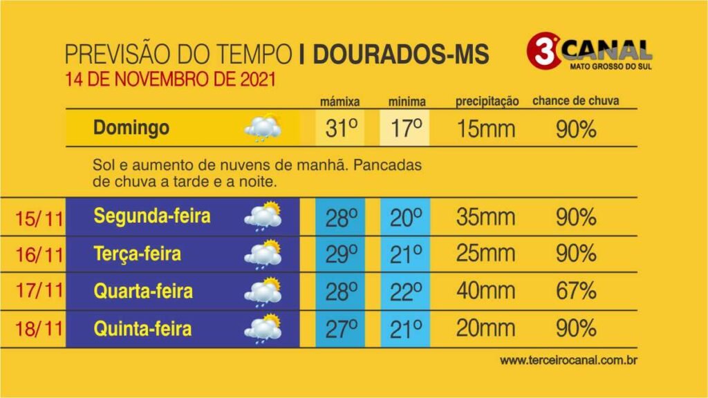 Previsão de chuva para os próximos 5 dias, domingo 14/11 – DOURADOS