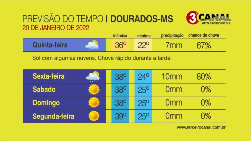 O tempo continua instável em Mato Grosso do Sul. Nesta quinta-feira (20) o sol aparece entre muitas nuvens, mas também podem ocorrer chuvas de intensidade moderada a forte com tempestades acompanhadas de raios, rajadas de vento e eventual queda de granizo.