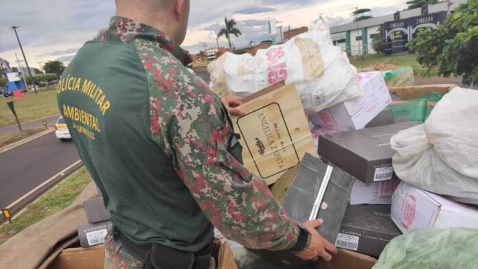 Policiais Militares Ambientais de Mundo Novo realizavam fiscalização no município de Iguatemi ontem (27) à tarde e apreenderam um veículo Tractor marca Axor com carreta acoplada, transportando produtos contrabandeados do Paraguai. Os policiais realizavam bloqueio e abordaram o motorista que demonstrou nervosismo. Ele informou aos Policiais que estava transportando bolsas com plásticos recicláveis, apresentando a nota fiscal que corresponderia a 20 toneladas de produtos plásticos para reciclagem.