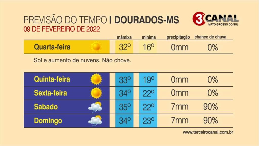 O sol brilha forte entre poucas nuvens nesta quarta-feira (09) em Mato Grosso do Sul. De acordo com o Centro de Monitoramento do Tempo e do Clima, uma massa de ar seco, que é um sistema meteorológico de alta pressão, iniciou a semana atuando na região sudoeste, mas já avança para grande parte do Estado.