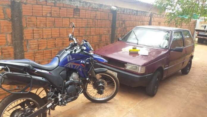 Diante da situação, com autorização, a equipe policial militar acompanhou a vítima até o local, que se tratava de um imóvel aparentemente abandonado, com um veículo Uno de cor vinho na garagem, que após checado foi constatado ser produto de furto/roubo.
