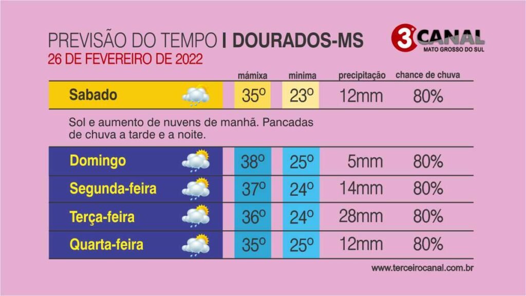 O sábado (26) de carnaval será de tempo firme em grande parte de Mato Grosso do Sul. O sol brilha forte com variação de nuvens, com períodos que variam de céu claro a parcialmente nublado, e as temperaturas continuam elevadas ao longo de todo dia.