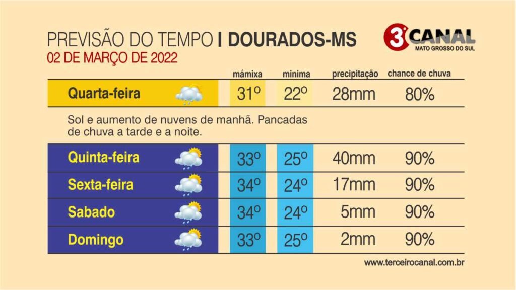 Previsão do tempo para esta quarta-feira 02/03 – DOURADOS