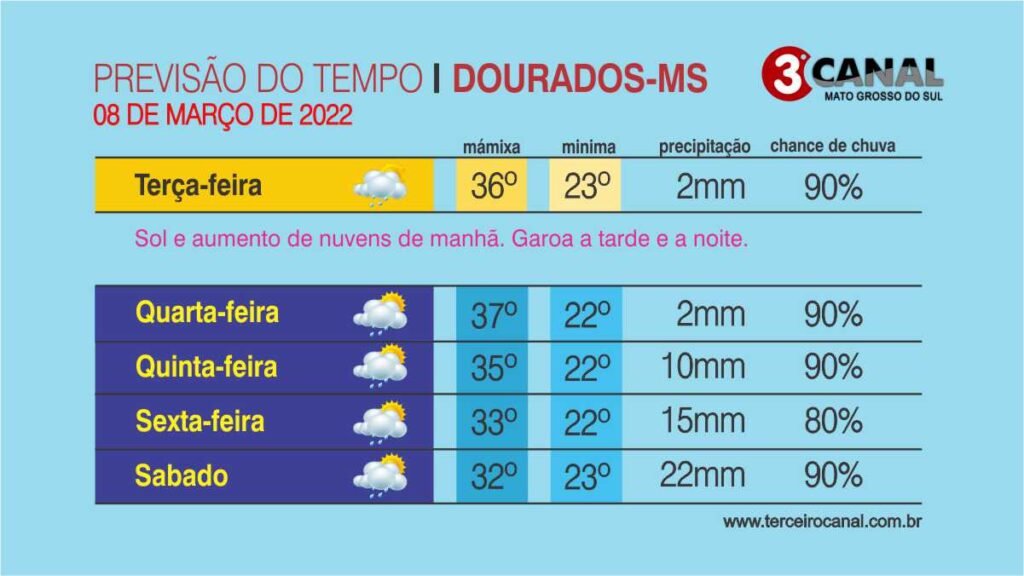 Nesta terça-feira, 8 de março, dia internacional da mulher, as condições típicas de verão seguem predominando em grande parte de Mato Grosso do Sul. O sol brilha forte com variação de nebulosidade durante o dia, devido a um sistema de alta pressão que deve manter o tempo quente e seco até quarta-feira (09) segundo o Centro de Monitoramento do Tempo e do Clima.