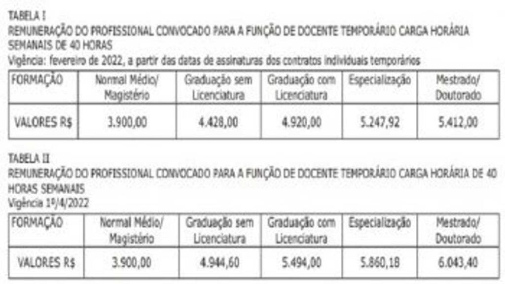 De acordo com a publicação, a menor remuneração, de R$ 3.900,00, é do professor convocado com normal médio/magistério, também para 40 horas/aula por semana.