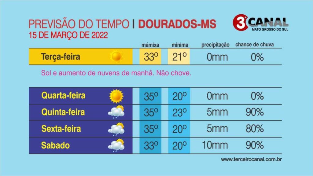 No período entre 14 a 22 de março, existe a probabilidade de chuvas de intensidade de moderada a forte e tempestades acompanhadas de raios, rajadas de vento e eventual queda de granizo. Os acumulados de chuva tendem a ficar entre 5-50 mm devido ao avanço de uma frente fria, associada a combinação de calor e umidade com o deslocamento de cavados. Os maiores acumulados de chuva estão previstos para a região leste. Abaixo você confere como ficara o tempo em Dourados nos próximos dias.