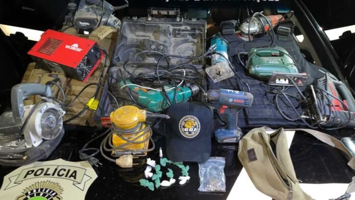 Em diligências nas proximidades do crime, os policiais identificaram os suspeitos e os localizaram. Com eles foram encontradas parte das ferramentas furtadas, total de 8 peças e certa quantidade de entorpecentes.
