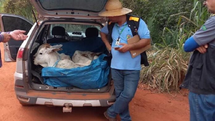 Fiscais do Indea flagraram uma situação inusitada durante a barreira volante na MT-100 no município de Cocalinho, na divisa com o Estado de Goiás. Eles autuaram um motorista de um veículo Pálio weekend transportando três bezerros de 5 a 12 meses no porta-malas.