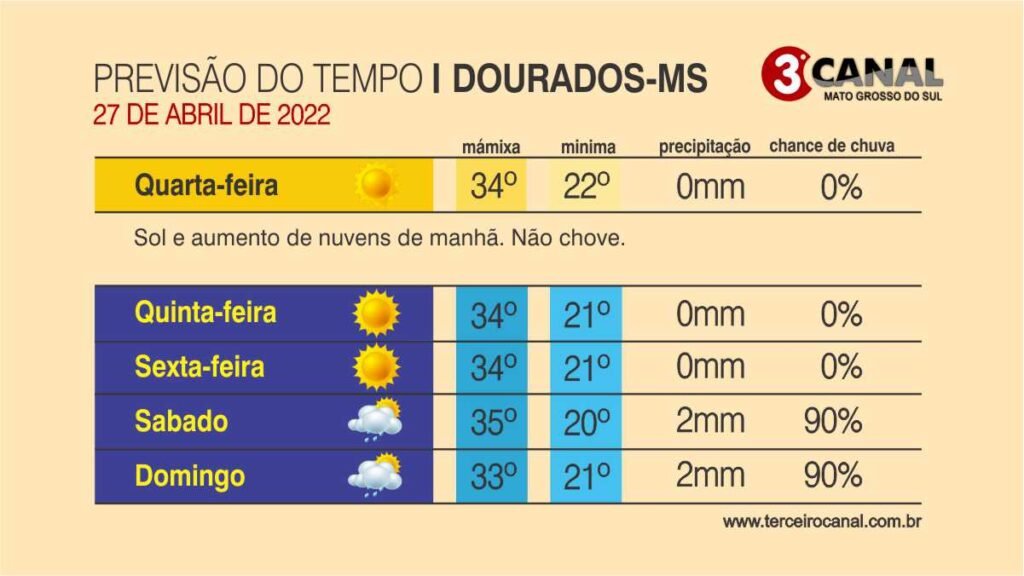 No Sul, Dourados e Mundo Novo devem ter mínimas de 22°C e máximas de 34°C e 33°C respectivamente.