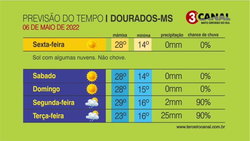 Na região Sudoeste de Mato Grosso do Sul, no município de Ponta Porã espera-se mínimas entre 12 e 14ºC e máximas que podem chegar a 22ºC.