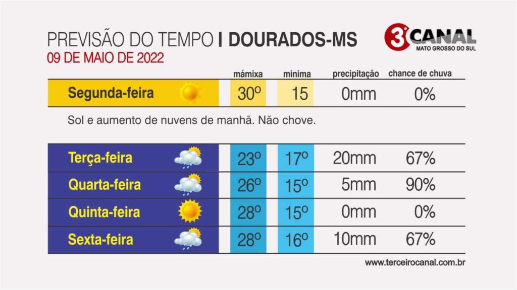 Previsão do tempo para esta segunda-feira 09/05 a sexta-feira 13/05 em Dourados