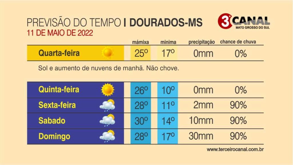 Para Corumbá, na região do Pantanal, a mínima será de 21°C e a máxima 28°C. Já em Porto Murtinho as temperaturas vão variar pouco – entre 20°C (mínima) e 22°C (máxima). Na segunda maior cidade do Estado, em Dourados, vai ficar entre 17°C (mínima) e 25°C (máxima).