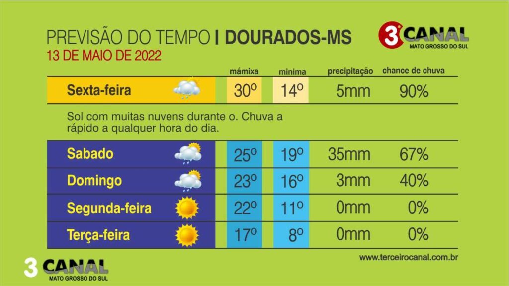 Previsão do tempo para esta sexta-feira 13/05 a terça-feira 17/05 em Dourados