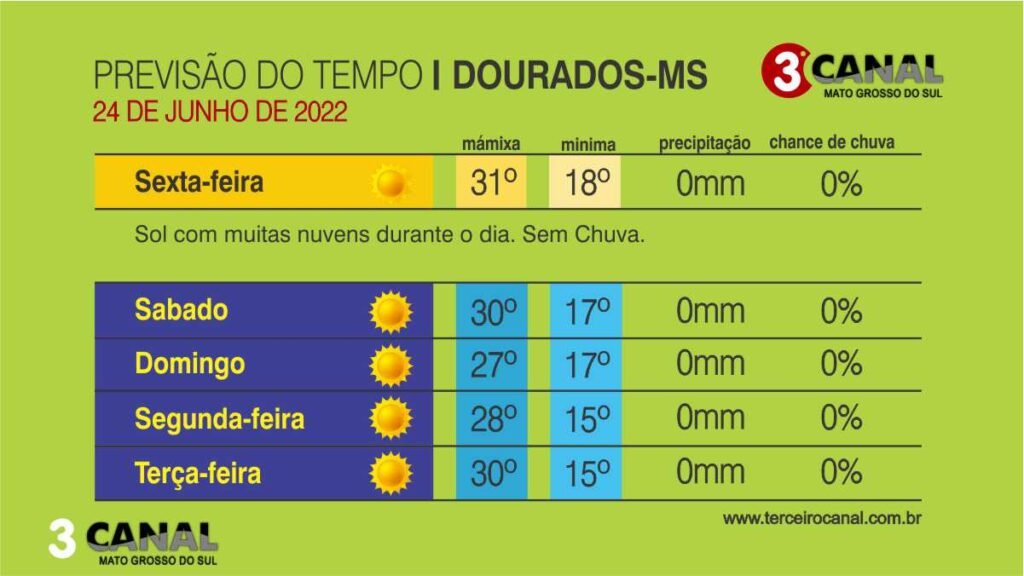 Previsão do tempo para esta sexta-feira 24/06 a terça-feira 28/06 em Dourados