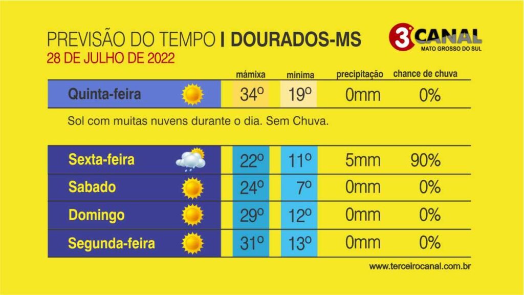 A temperatura começa a cair e nesta quinta-feira (28) de julho segue com tempo aberto em Dourados com previsão de chuva para a próxima sexta-feira nas regiões do cone-sul, sul-fronteira, leste, sudoeste. Os dados são do Centro de Monitoramento do Clima e Tempo de MS (CEMTEC-MS).