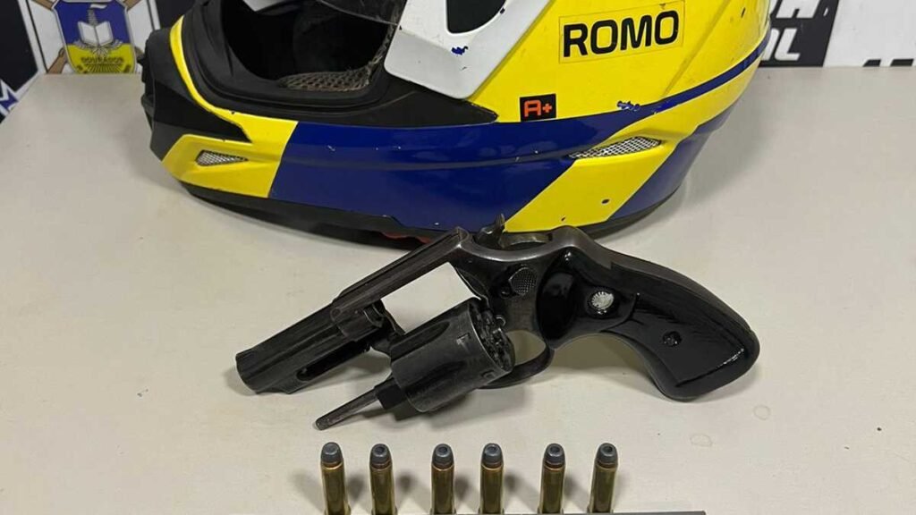 Durante as verificações foi localizado no interior do veículo um revólver, marca Taurus, calibre 357, carregado com 6 munições.
