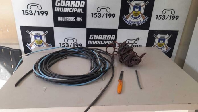 Os GMs realizavam rondas preventivas no parque quando avistaram o autor e em atitudes suspeitas. A equipe deslocou até uma área em construção e flagrou o rapaz desencapando os fios furtados utilizando uma faca de serra. Neste momento, fugiu correndo, porém foi contido pelos guardas municipais.