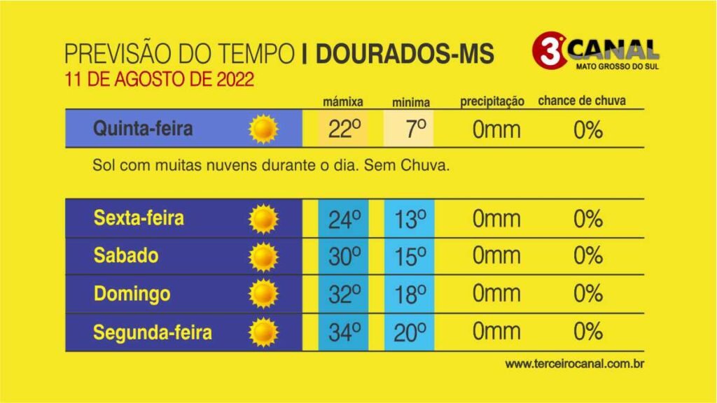 Com as temperaturas abaixas e um frio extenso durantes aos dias que se passaram, os dias começam a ficar mais agradável com as temperaturas subindo em Dourados e nas regiões sudoeste e pantaneira, o tempo segue firme sem possibilidades de chuvas para os próximos dias e o calor retorna a partir dessa quinta-feira (11).