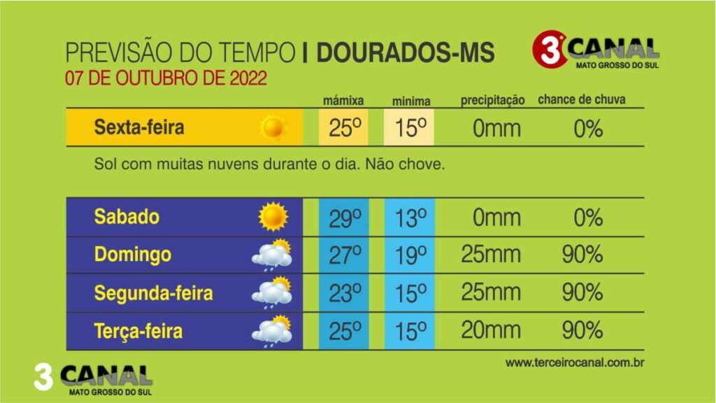 Os últimos dias do mês de setembro foram marcados pela chuva calor e ar seco em Mato Grosso do Sul. O Centro de Monitoramento do Tempo e do Clima (Cemtec) estima possibilidade de pancadas fracas e isoladas de chuva para o Estado, especialmente para as regiões centro-norte, leste e nordeste neste início de final de semana. Porem para esta sexta-feira não a possibilidades de chuvas para região de Dourados, mas o tempo ficara nublado mas sem chuvas.