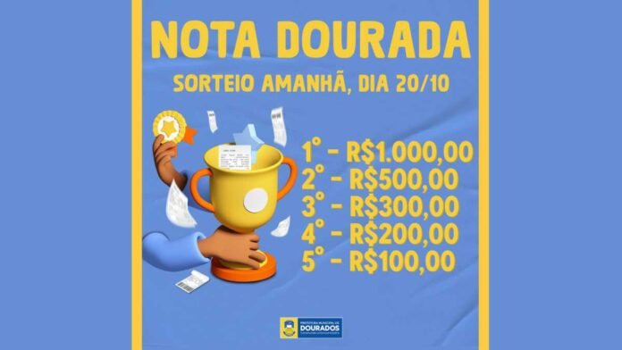 Os cinco premiados deste mês do Programa Nota Dourada serão conhecidos nesta quinta-feira (20). O sorteio acontece com base nos números sorteados na Loteria Federal. Os prêmios concedidos a cada um dos ganhadores são de R$ 100, R$ 200, R$ 300, R$ 400, R$ 500 e R$ 1 mil, respectivamente. Para participar, o cidadão deve cadastrar o CPF no site oficial e pedir que o documento seja colocado na nota fiscal emitida após utilização de serviços no município.