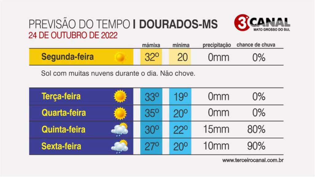 Porém para este segunda (22/10) a previsão do Centro de Monitoramento do Tempo e do Clima (Cemtec) indica tempo aberto sem possibilidades de chuvas em Dourados.