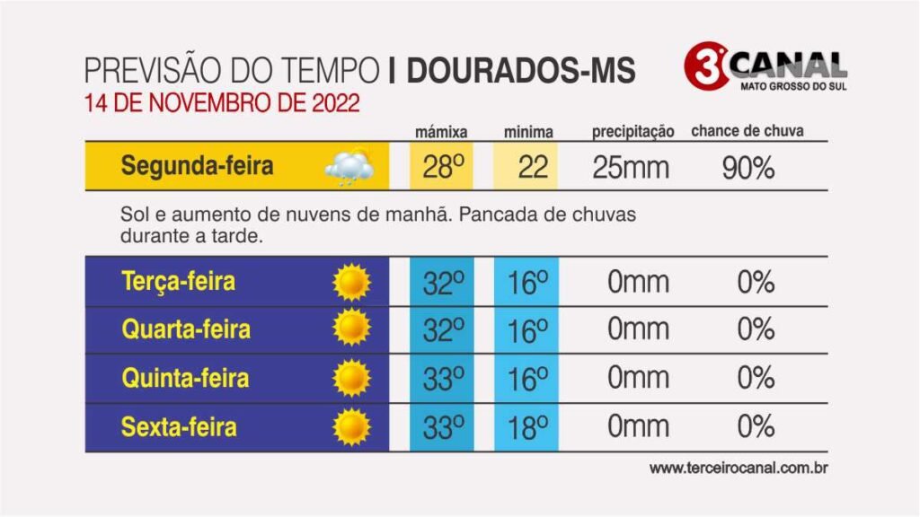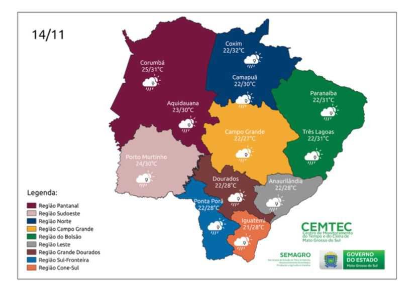 São esperadas temperaturas mínimas entre 21 e 22°C e máximas de até 31°C nas regiões Sul e Leste. Nas regiões Norte, Pantaneira, Bolsão e Sudoeste mínimas entre 22 e 25°C e máximas de até 35°C. Em Campo Grande, mínima entre 22 e 23°C e máxima de até 29°C.