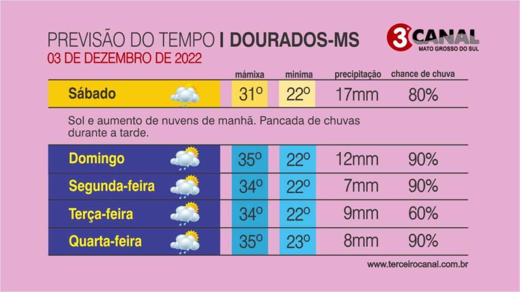 O sábado (03) em Mato Grosso do Sul será de tempo instável em todas as regiões. Chuvas de intensidade fraca a localmente forte e tempestades estão na previsão do Centro de Monitoramento do Tempo e do Clima (Cemtec).