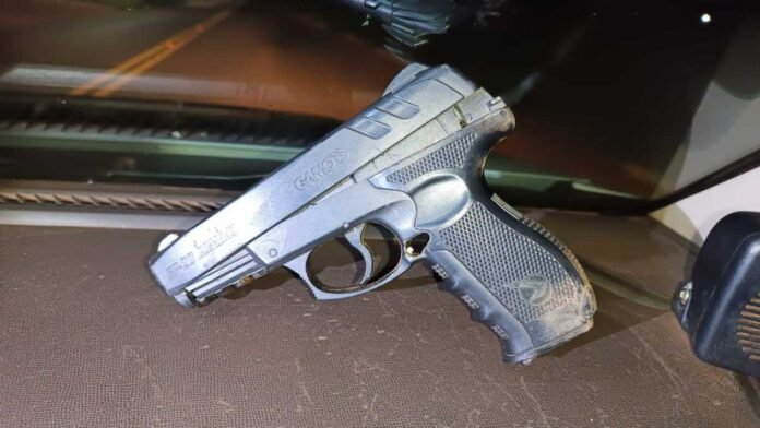 Ainda, no momento em que o autor avistou a viatura policial se aproximando, o mesmo abandonou o simulacro da marca GAMO, modelo GP-20 COMBAT, atrás do portão da residência das vítimas e saiu correndo em direção à motocicleta.