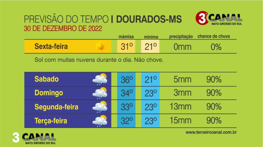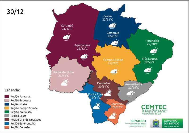 A meteorologia indica que a sexta-feira (30) ainda será de tempo instável em Mato Grosso do Sul. São esperadas chuvas e tempestades nas regiões centro-norte e leste, provocadas pelo aquecimento diurno.