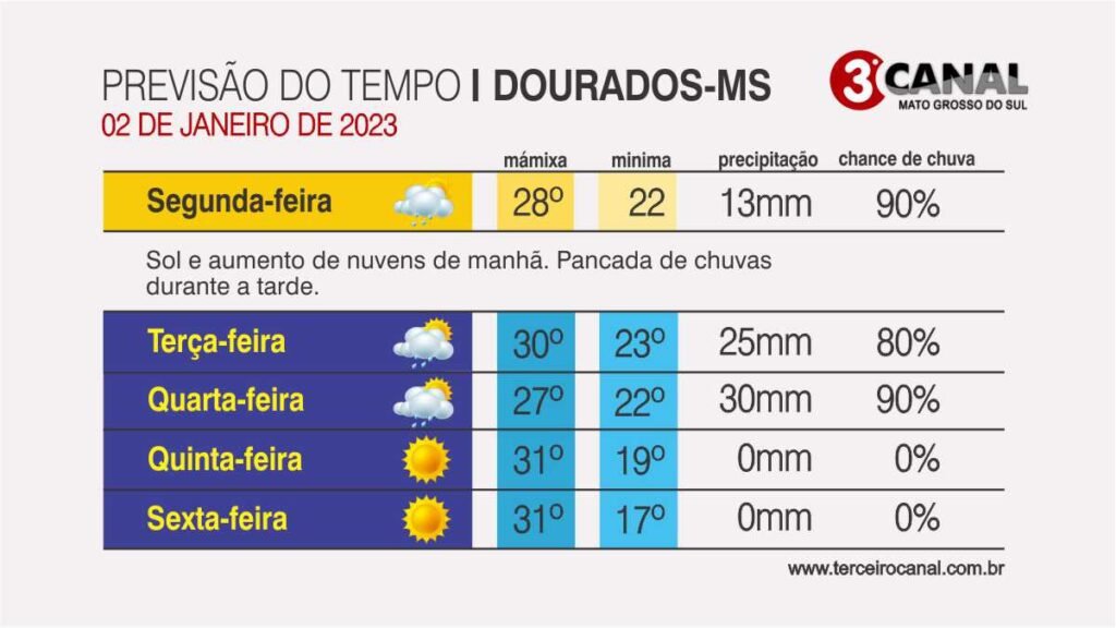 Nuvens carregadas e chuva forte devem marcar a primeira segunda-feira do ano em Mato Grosso do Sul. Previsão elaborada pelo Centro de Monitoramento do Tempo e do Clima (Cemtec/Semagro) indica que uma nova frente fria vai favorecer a formação de chuvas de intensidade moderada a forte e tempestades acompanhadas de raios e rajadas de vento, especialmente nos municípios das regiões central, sul/sudeste e nordeste do Estado.