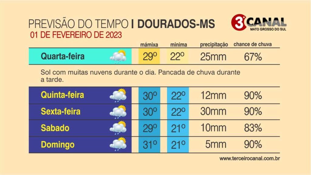 Previsão do tempo para esta quarta-feira 01/02 a domingo 05/02 em Dourados