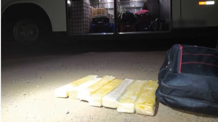 Na bagagem foram encontrados 7 tabletes de substância análoga à maconha, que totalizou 6,8 kg.