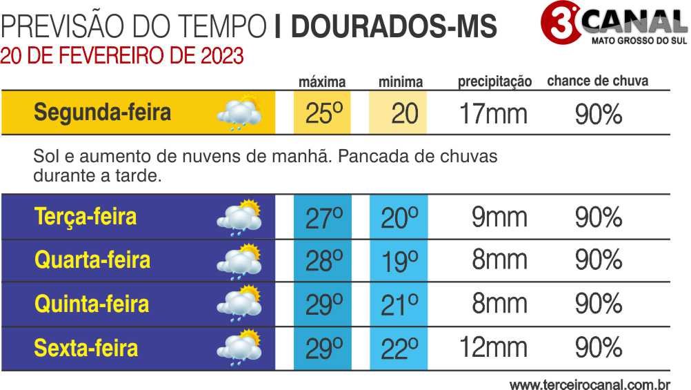 De acordo com o Cemtec (Centro de Monitoramento do Tempo e do Clima do MS) estão previstas temperaturas mínimas entre 20°C e 22°C e máximas de até 30°C nas regiões sul, sudoeste e leste do Estado.