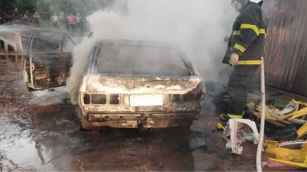 Ao chegar em casa, o E.G. pegou um galão de gasolina, despejou o combustível no veículo e ateou fogo. Vendo a cena, a companheira do autor acionou a Polícia Militar (PM). Uma equipe da PM compareceu ao local e solicitou o apoio do Corpo de Bombeiros Militar, que extinguiu o fogo.